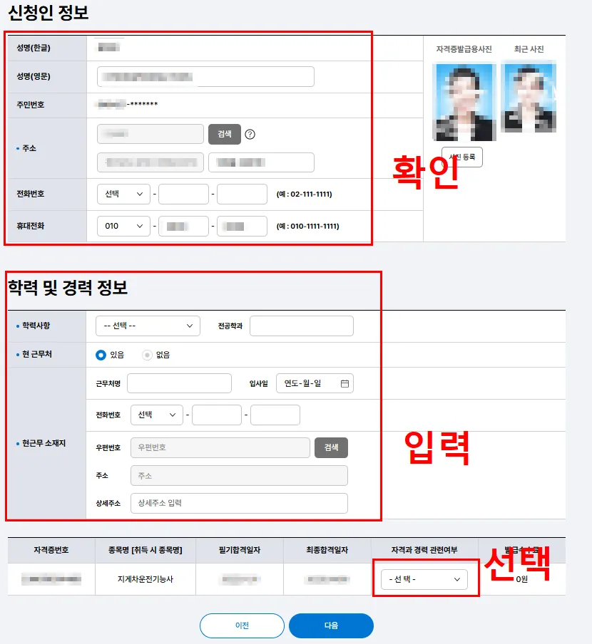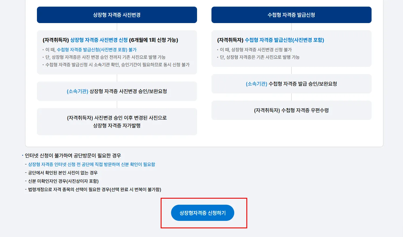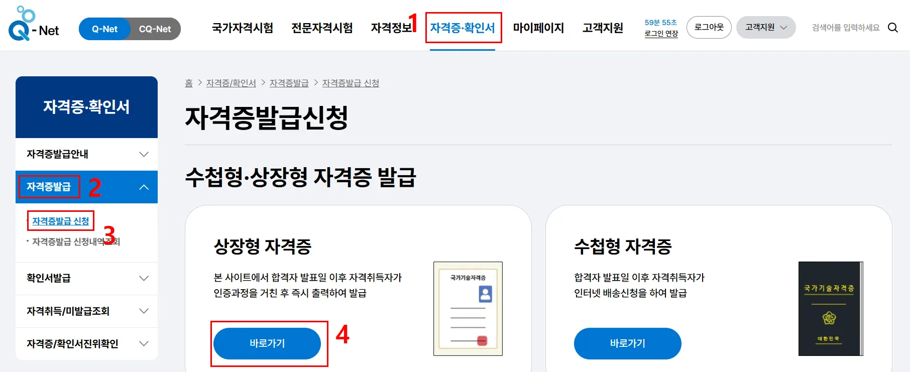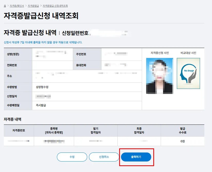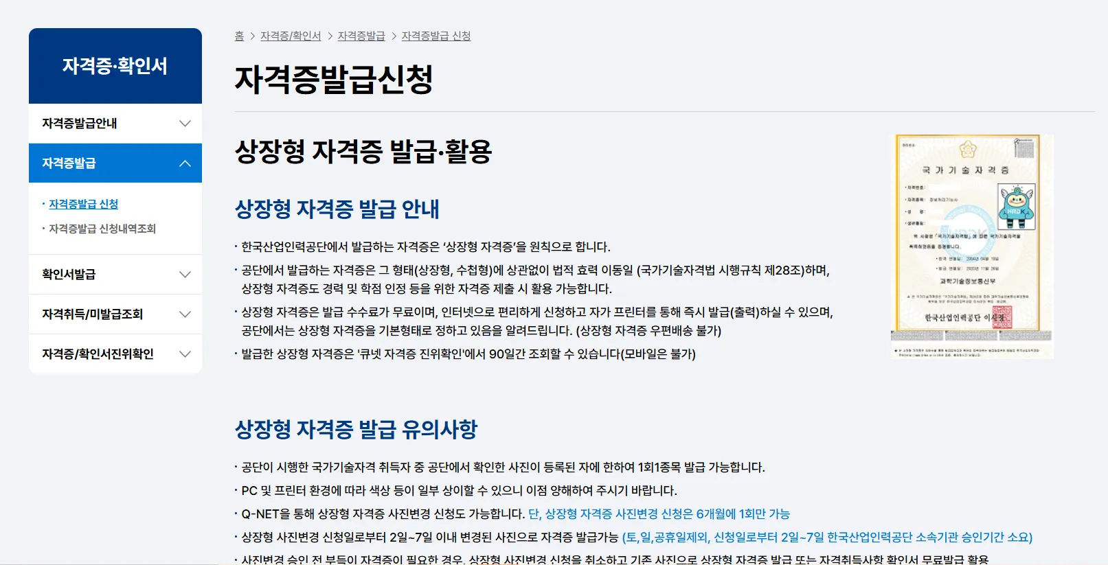 자격증 발급신청 화면 내용 읽어보고 제일 하단의