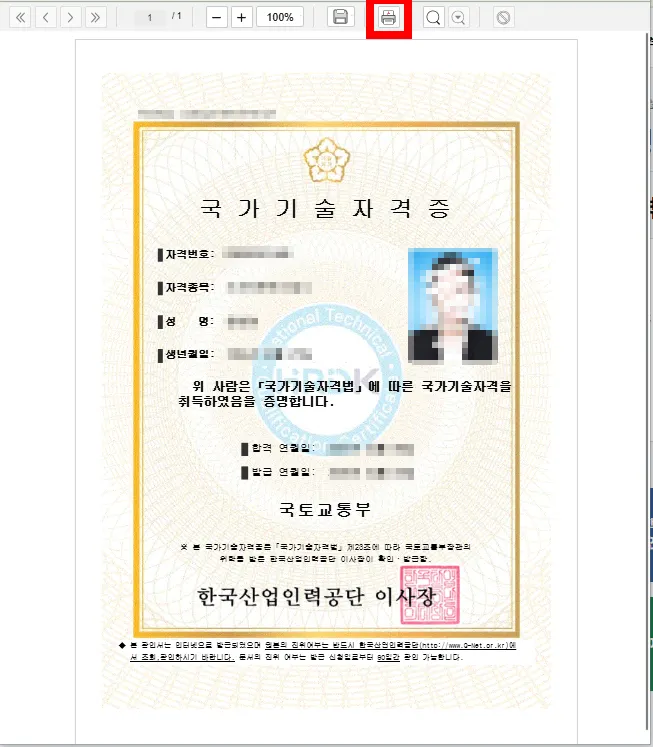건설기계조종사 면허증 발급 받으실 경우, 상장형 자격증으로 출력해서 가져가시면 됩니다.